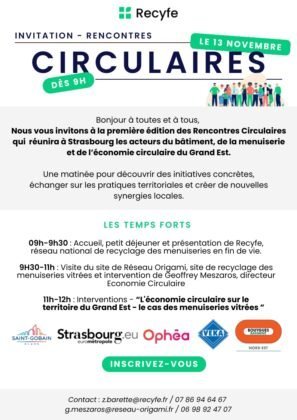 L’équipe Recyfe et Réseau Origami ont le plaisir de vous convier à leur premier événement “rencontres circulaires”. Nous vous donnons rendez-vous à Strasbourg pour une matinée consacrée à l’économie circulaire dans le bâtiment et plus particulièrement au cas des menuiseries vitrées. Une occasion unique de découvrir des retours d’expériences concrets et de rencontrer des acteurs qui font bouger les lignes sur votre territoire.